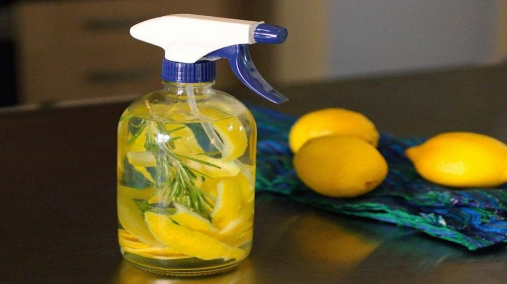 Dazu benötigen Sie Zitronenschalen, so viel, dass sie in jedes Glas passen, das Sie haben. Geben Sie Ihre Zitronenschale in das Glas und gießen Sie dann weißen Essig darüber. Lassen Sie die Lösung einige Wochen einwirken, entfernen Sie dann die Schalen und entsorgen Sie sie. Verdünnen Sie die Mischung mit Wasser im Verhältnis 1:1 und gießen Sie sie dann in eine Sprühflasche. Sie können den Geschmack variieren, indem Sie der Zitronenschale im Glas Mandelextrakt, Knoblauchzehen oder ganze Zimtstangen hinzufügen.