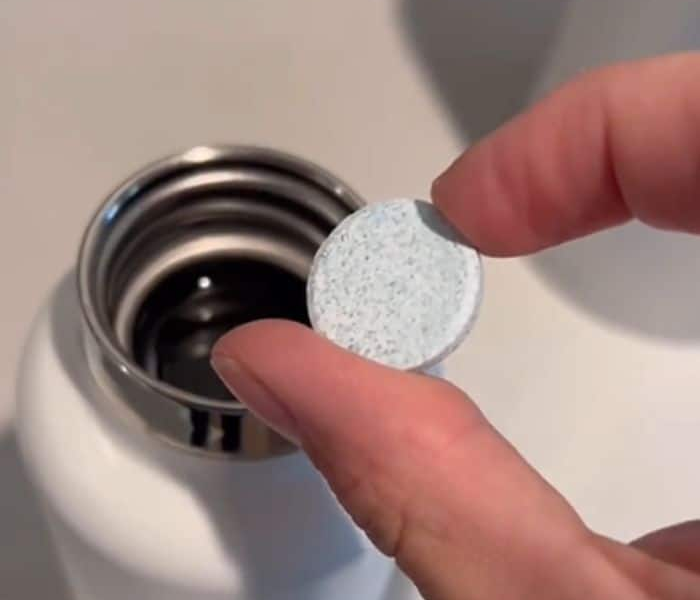 Hat Ihre Wasserflasche einen seltsamen Geschmack oder Geruch, den Sie nicht loswerden können? Verwenden Sie Prothesenreinigungstabletten. Sie eignen sich hervorragend zum Reinigen und Entfernen von Gerüchen aus Ihrer Wasserflasche. Füllen Sie es einfach mit Wasser und fügen Sie dann die Prothesenreinigungstabletten hinzu.