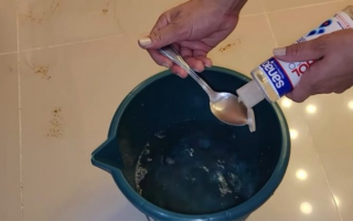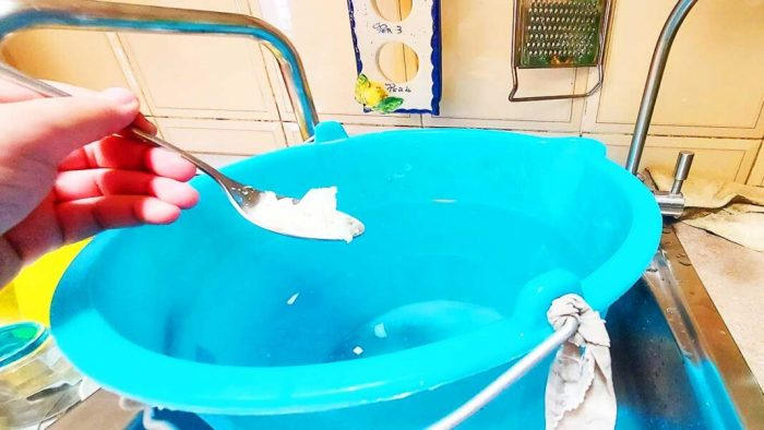 Wasser und Brennspiritus hinzufügen, dann Backpulver und Marseille-Seife dazugeben und gut vermischen, bis alles verrührt ist verdünnen und die Mischung in den Eimer gießen.