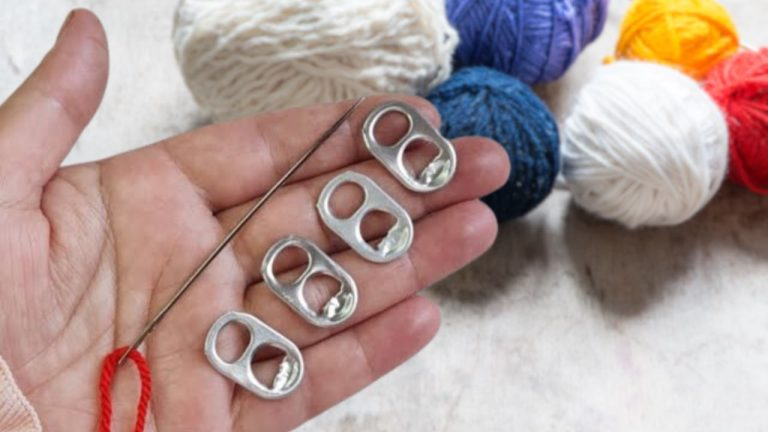 Wie Sie bereits gelesen haben, benötigen Sie für dieses Projekt 4 Laschen aus Aluminiumdosen und Wollfaden in der von Ihnen bevorzugten Farbe. Außerdem benötigen Sie eine nicht zu feine Nadel, damit der Wollfaden durch das Öhr gehen kann. Und dann eine Perle.