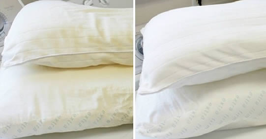 Backpulver und Essig. Mischen Sie 90 g Natron mit 90 ml Essig und waschen Sie mit dieser Lösung. Zweimal ausspülen. Zusätzlich zum ordnungsgemäßen Waschen und Desinfizieren Ihrer Kissen machen beide Inhaltsstoffe sie weiß.