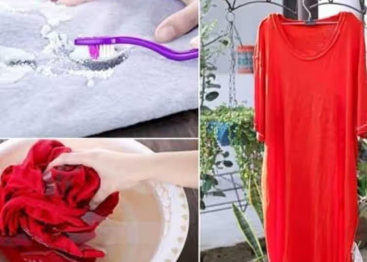 Sie benötigen: den Saft von zwei Zitronen, drei Esslöffel Meersalz (30 g) und fünf Tassen Wasser. Sie müssen die Kleidung lediglich etwa zwanzig Minuten lang in dieser Mischung einweichen und ausspülen.