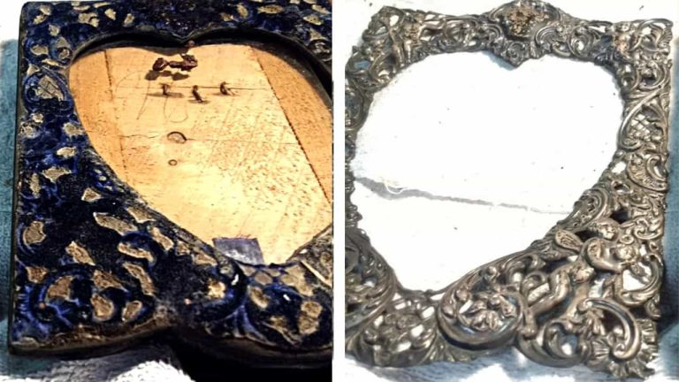 Eine Frau reinigt einen angelaufenen Silberrahmen