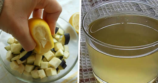 Lassen Sie es mindestens eine Stunde ruhen, filtern Sie es dann und trennen Sie das Wasser von den Auberginenstücken. Bewahren Sie die Zubereitung in einer Flasche auf und fügen Sie den Saft einer halben Zitrone hinzu.