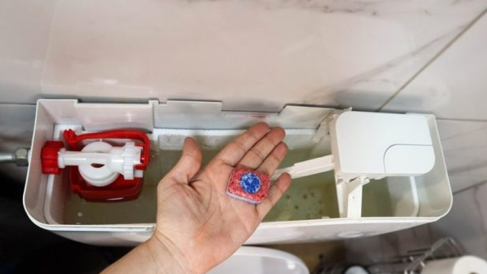 Um den Wandablauf Ihrer Toilette zu reinigen,    öffnen Sie den Tank und geben Sie eine Spülmaschinentablette hinein    . Auf diese Weise löst sich die Kapsel jedes Mal, wenn Sie die Toilette spülen, allmählich auf. Neben der Reinigung ist diese Methode auch wegen des köstlichen Geruchs nützlich, den sie verströmt.