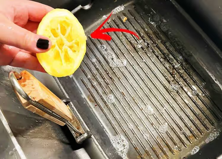 Um eine Zitrone zu verwenden, schneiden Sie einfach die Hälfte davon ab, geben Sie Backpulver darüber und reiben Sie die Grillpfanne kräftig damit ein, als wäre sie ein Schwamm.