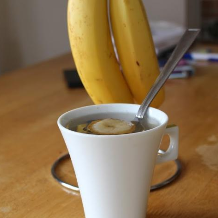 Das Wasser zum Kochen bringen, dann die in Stücke geschnittene Banane (einschließlich Schale) und den Löffel Zimt dazugeben und bei schwacher Hitze 20 Minuten kochen lassen. Das Ergebnis ist ein dunkles Gebräu mit einem sehr süßen Geschmack.