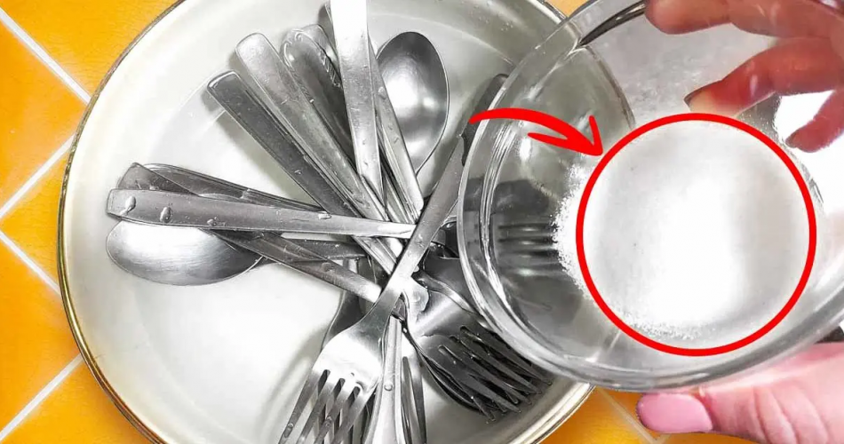 Geben Sie einfach 3 Esslöffel Backpulver in einen Behälter mit heißem Wasser und tauchen Sie Ihr schmutziges Besteck hinein. Einige Stunden einwirken lassen. Anschließend herausnehmen und mit klarem Wasser abspülen. Mit einem Tuch trocknen. Sie werden mit dem Ergebnis zufrieden sein!