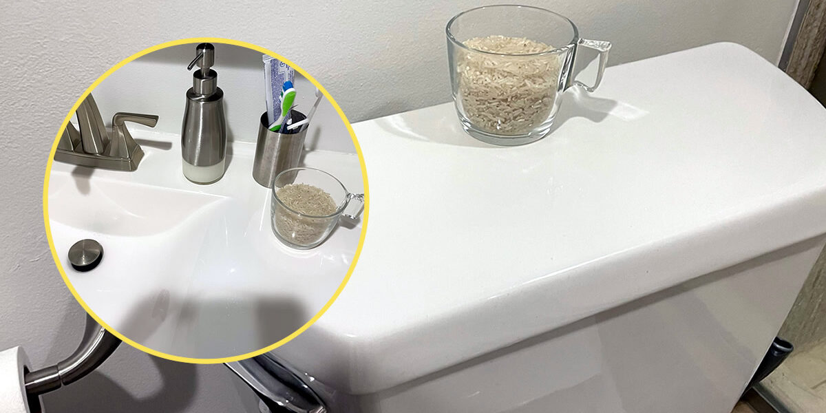 Die Umsetzung des Tricks ist ganz einfach: Füllen Sie einen Behälter mit Reis, Sie können eine Schüssel oder ein Glas verwenden, und stellen Sie ihn an eine gut sichtbare Stelle im Badezimmer. Unser Rat ist, es auf die Toilettentruhe zu legen.