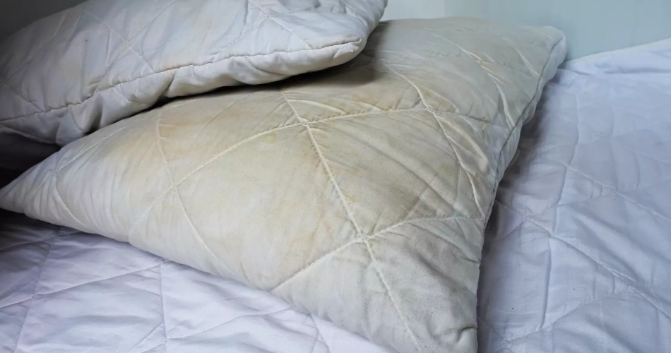 Beim Schwitzen entstehen gelbe Flecken auf Kissen. Es ist wichtig, sie zu waschen, um die Entwicklung von Bakterien zu verhindern.