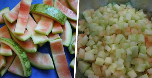 - Die Wassermelonenschalen dazugeben und etwa 2-3 Minuten kochen lassen, dann abgießen und die Schalen unter kaltem Wasser abspülen.