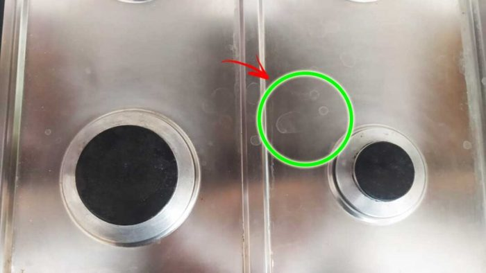 Tränken Sie ein feuchtes Tuch oder einen Schwamm mit Tonstein und führen Sie ihn über den Edelstahl. Seien Sie vorsichtig, reiben Sie nicht zu viel. Anschließend mit klarem Wasser abspülen und schnellstmöglich mit einem Mikrofasertuch trocknen.