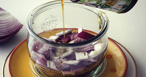 Einige Minuten ruhen lassen, dann den Honig und den Saft frisch gepresster Zitronen hinzufügen. Gut vermischen, bis eine homogene Lösung entsteht, dann wieder abkühlen lassen. Anschließend die Zwiebelstücke herausnehmen und in einem Glasbehälter aufbewahren.