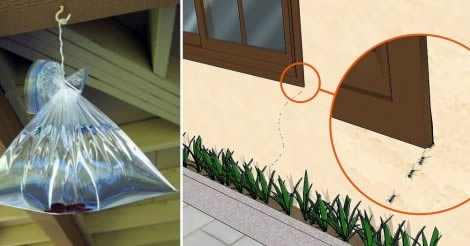 Anti-Fliegen-Taschen . Gießen Sie Wasser und etwa 5–6 Münzen in einen luftdichten Plastikbeutel. Sobald es geschlossen ist, platzieren Sie es an Türen und Fenstern, wo Fliegen eindringen können. Die durch das Wasser verstärkte Lichtreflexion auf den Münzen hält Fliegen fern.