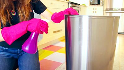 In diesem großartigen Video-Tutorial von Clean My Space auf YouTube erfahren Sie, wie Sie alle Ihre Mülltonnen in nur wenigen Schritten reinigen können. Sie beginnen mit der Herstellung Ihres Allzweckreinigers, indem Sie zu gleichen Teilen weißen destillierten Essig und Dawn-Flüssigkeit mischen.