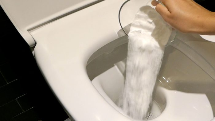 Bikarbonat kann auch mit grobem Salz kombiniert werden, das zur Desinfektion und zur Reduzierung der Wasserhärte verwendet wird. Mischen Sie 100 g Salz mit 100 g Bikarbonat und gießen Sie alles in die Toilette. Schrubben Sie die Ränder mit einer Zahnbürste und lassen Sie es einige Stunden einwirken (besser über Nacht). Wenn Sie aufwachen, spülen Sie die Toilette und bewundern Sie das Ergebnis!