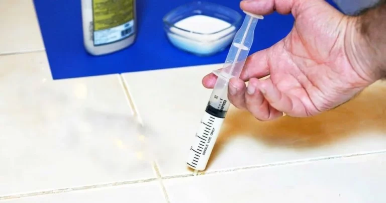 Sobald Sie die Fugen durchstochen haben, nehmen Sie die Spritze und füllen diese mit wasserbeständigem Fliesenkleber . Gehen Sie langsam vor, führen Sie die Spritze in die Löcher ein und geben Sie kleine Mengen Kleber ab. Sie werden sofort sehen, dass es einige Zeit dauern wird, bis der Kleber herauskommt. Dies liegt daran, dass durch die Löcher, die Sie zuvor mit dem Bohrer gebohrt haben, Kanäle mit Hohlräumen unter der Fliese entstanden sind, die mit dem Kleber gefüllt werden. Machen Sie sich keine Sorgen, wenn der Kleber auf die Fliesen ausläuft , da er sich nach Abschluss des Vorgangs leicht entfernen lässt.