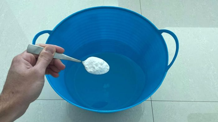 Um es in einem Eimer zu verwenden, multiplizieren Sie alle Zutaten mit 4. Wenn am Ende der Reinigung noch Waschmittel übrig ist, werfen Sie es weg und bewahren Sie es nicht auf.