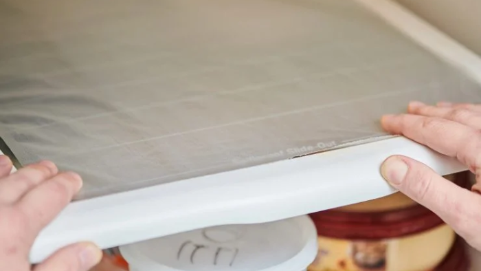 Nehmen wir nun eine Rolle Plastikfolie. Schneiden wir es aus einem Blatt Papier in der exakten Größe jedes Regals aus, um eine Art Schutzbarriere zu schaffen.