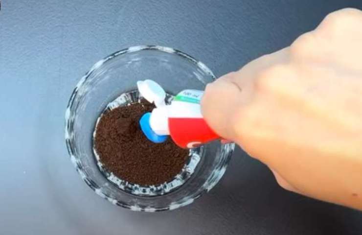 Geben Sie einen Löffel Instantkaffee in eine kleine Schüssel, geben Sie etwas Zahnpasta hinzu und beginnen Sie mit dem Mischen . Es muss nicht hart, aber auch nicht flüssig sein, passen Sie es entsprechend an. Wichtig ist, dass man am Ende eine Art formbaren und nicht bröckelnden Teig erhält.