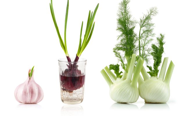 Fenchel kann man fast genauso einfach nachziehen wie Frühlingszwiebeln – allerdings nur das Kraut. Einfach die Knolle des Fenchel in ein Glas Wasser stellen und das Wasser regelmäßig wechseln.