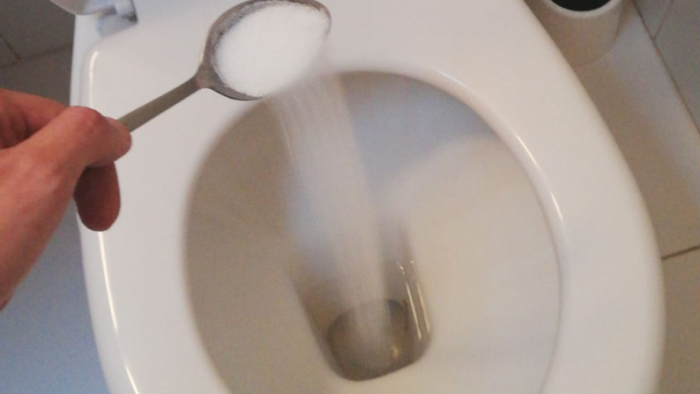 Unsere Badezimmer werden mit Salz desinfiziert, wodurch das Wasser weniger hart wird. Weißer Essig ist beim Entfernen von Kalkablagerungen sehr nützlich. Zur besseren Reinigung bedecken Sie die Innenkeramik der Toilettenschüssel mit Natron und gießen Sie Essig darüber, nachdem Sie ihn aufgekocht haben.