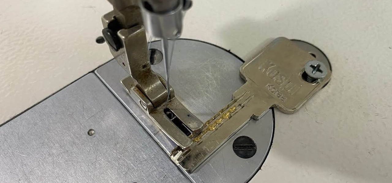 Aber wie benutzt Oma einfach einen Schlüssel? Es ist ganz einfach: Stecken Sie einfach den Schlüssel mit einem Stück Stoff darunter mit einem Nagel in das kleine Loch in der Nähmaschine. Von nun an dient der Schlüssel als Führung, vor allem aber blockiert er den Stoff, der unter der Nadel der Nähmaschine durchläuft.