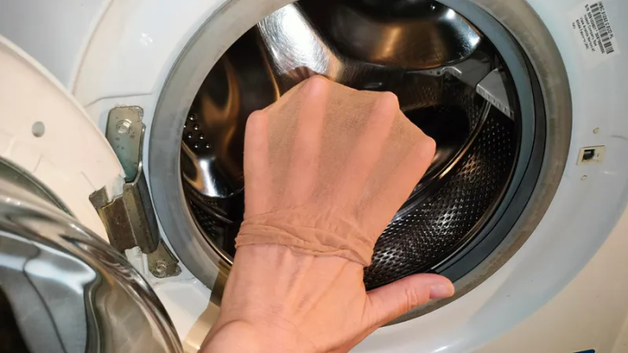 Während des Betriebs, insbesondere über einen längeren Zeitraum, können Kratzer und andere Schäden im Inneren der Trommel auftreten. Alles, was Sie tun müssen, ist ein paar Strumpfhosen, Socken oder übergroße Socken aus Ihrem Kleiderschrank zu holen. Mit ihrer Hilfe können Sie den Zustand der Waschmaschinentrommel feststellen.