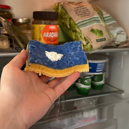 Nehmen Sie dann den Biskuit mit dem Natron und stellen Sie ihn in den Kühlschrank. Das ist ein einfacher Trick, der nichts kostet, aber was nützt er? Das Natron im Kühlschrank beseitigt alle schlechten Gerüche und der Schwamm nimmt sie auf.
