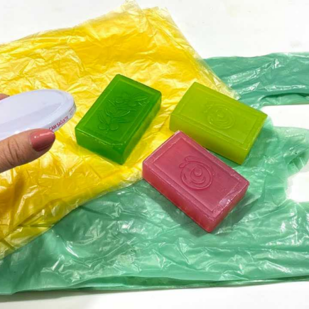 Sie werden feststellen, dass die Umschläge zusammenkommen, kleiner werden und kompakter wirken. Fahren Sie mit dem Bügeleisen fort, bis sie gut verbunden sind. Dann können wir aus der Seife Kugeln formen. Wir benötigen eine transparente Seife, vorzugsweise grün, da wir daraus Traubenzapfen herstellen werden.