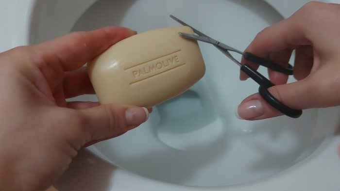 Dann öffnen wir die  Maske  und geben ein oder zwei Kugeln der zunächst aus Seife, Bikarbonat und Salz gewonnenen Mischung hinein. Während wir das Gummiband behalten, schließen wir das Ende mit einem sehr festen Knoten. Also gehen wir ins Badezimmer, öffnen den Toilettenspülkasten, in dem  sich sozusagen das Wasser befindet  , und tauchen die Maske ins Wasser.