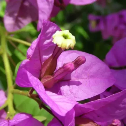 - Bougainvillea refulgens : Bei dieser Art, ebenfalls brasilianischen Ursprungs, sind die Hochblätter in hängenden Rispen mit violetten Farbtönen gruppiert, was ein prächtiges Ergebnis ergibt.