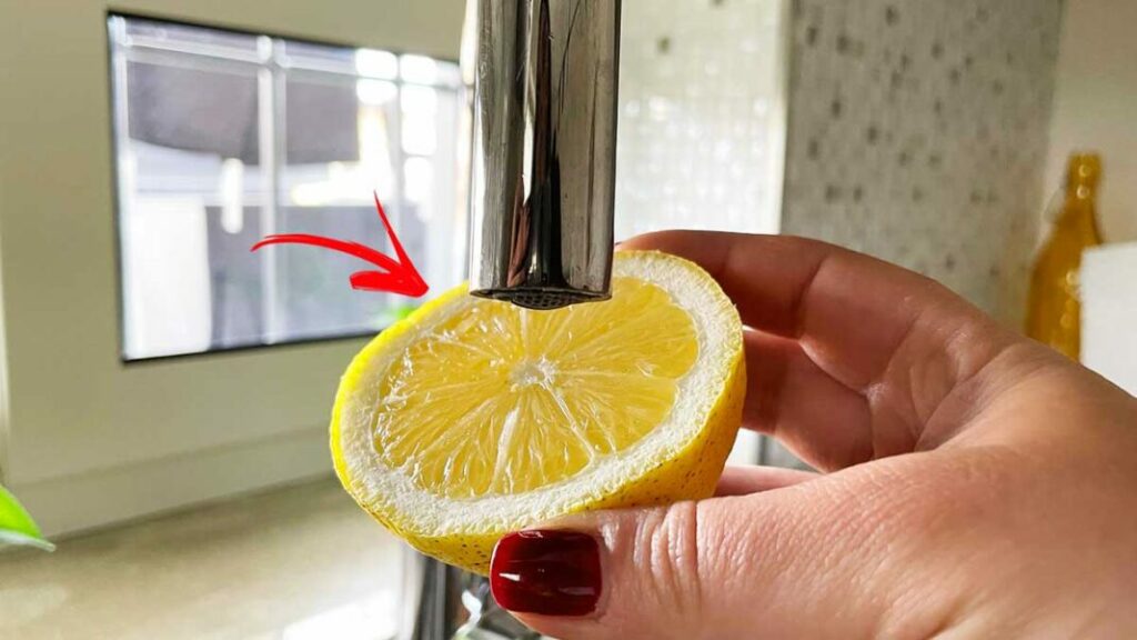 Wir empfehlen Ihnen daher,  eine halbe Zitrone zu nehmen  und sie über den Wasserhahn zu reiben. Lassen Sie es   einige Minuten einwirken  , spülen Sie es dann aus und entfernen Sie den Überschuss mit einem sauberen, trockenen Tuch.