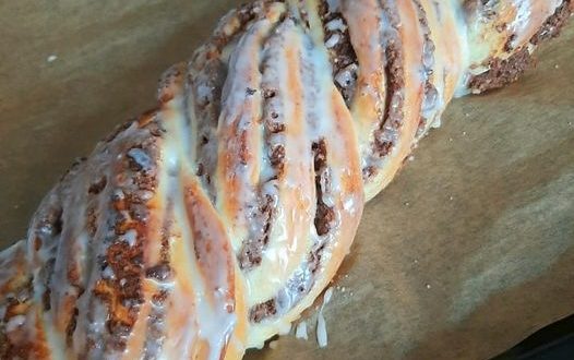 Der Teig zu einem Rechteck ausrollen mit Fühlung gleichmäßig bestreichen und aufrollen. Die Rolle in der Mitte der Länge nach mit einem scharfen Messer durchschneiden und beide Teile verflechten..