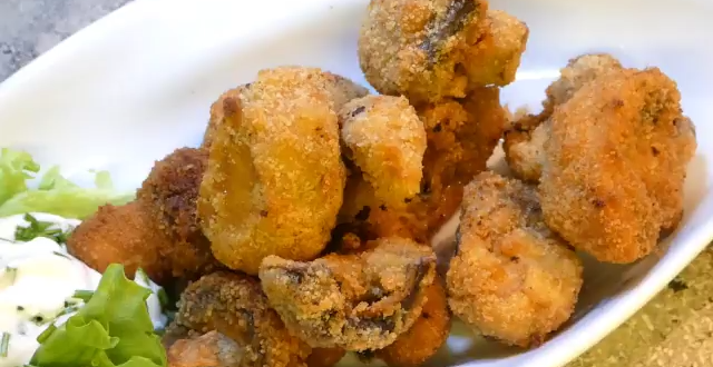 Die frittierten Champignons auf einem Küchentuch abtropfen lassen und mit dem Kräuterquark servieren