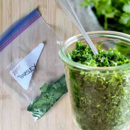 Im Gefrierschrank können Sie   es auch mit Knoblauch aufbewahren.  Petersilie und Knoblauch ergeben eine tolle Mischung, die häufig zur Herstellung von Semmelbröseln verwendet wird. Während Sie die Petersilie hacken, fügen Sie zwei Knoblauchzehen hinzu und bewahren Sie sie ebenfalls in einem Glas auf. Diese Mischung kann im Gefrierschrank monatelang haltbar sein.