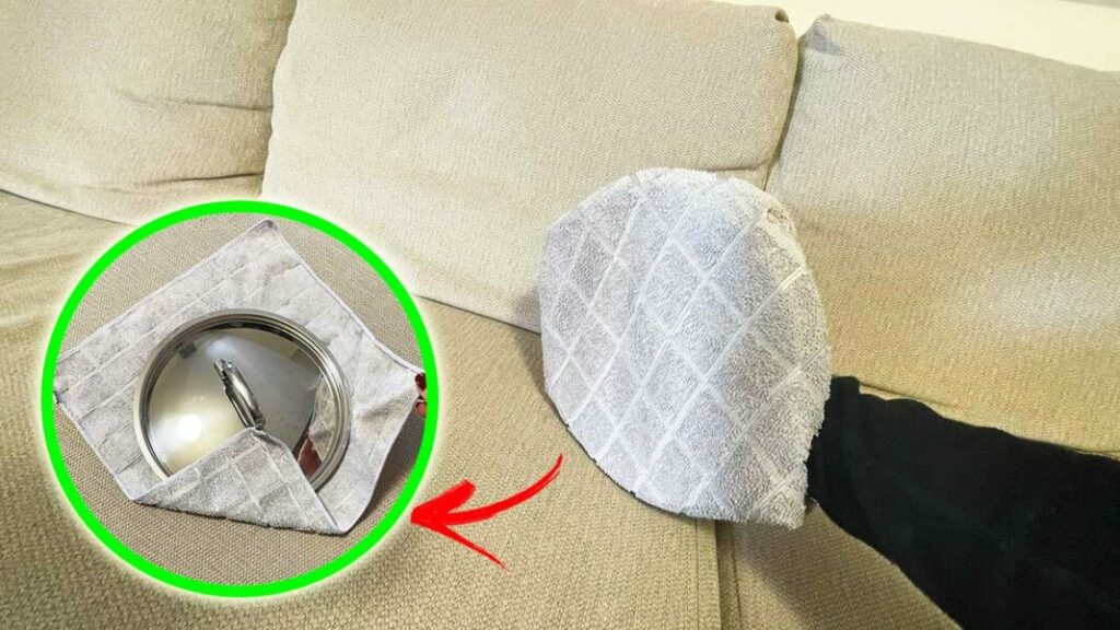 Nehmen Sie den Griff des Deckels , führen Sie ihn über das gesamte Sofa, spülen Sie dann das Tuch aus, wringen Sie es gut aus und machen Sie einen zweiten Durchgang.