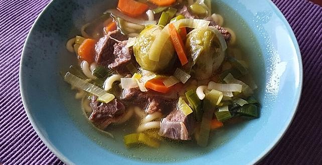 Fleisch aus der Brühe nehmen und beiseitestellen. Brühe durch ein Sieb in einen Topf gießen. Beiseitegestelltes Suppengrün und Lauch zugeben. Zugedeckt aufkochen und bei milder Hitze 10 Minuten kochen lassen. Nudeln zugeben und nach Packungsanweisung in der Brühe garen. Inzwischen das Fleisch vom Knochen lösen, Sehnen und Fett entfernen. Fleisch 2 cm groß würfeln und in die Brühe geben. Schnittlauch in feine Röllchen. Suppe evtl. nachwürzen und mit Schnittlauch bestreut anrichten.