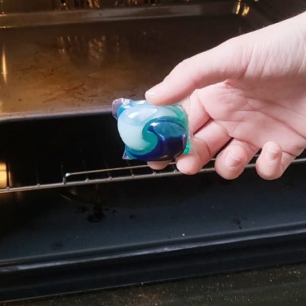 Wir reiben die Tablette an der Tür unseres Backofens , damit sich alle Verkrustungen und Fette leicht lösen lassen, und gehen dann mit einem Mikrofasertuch darüber , damit das freigesetzte Reinigungsmittel entfernt wird.