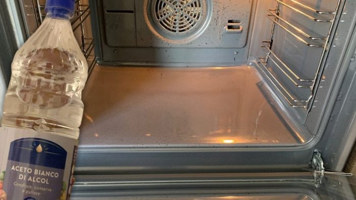 Essig hilft auch dabei, zukünftige Fettablagerungen auf den Innenflächen des Ofens zu verhindern.