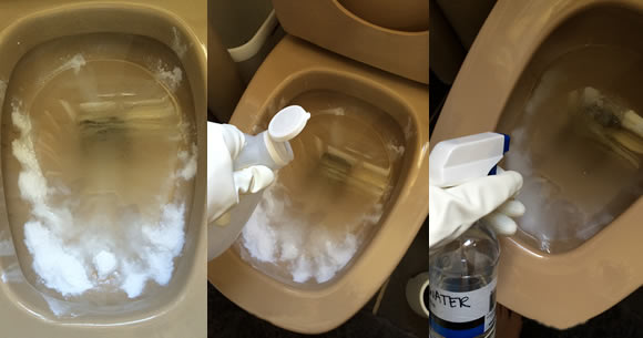 Füllen Sie die Sprühflasche mit Essig und sprühen Sie die gesamte Toilettenschüssel ein, insbesondere die Bereiche, in denen das Natron noch nicht gewirkt hat.