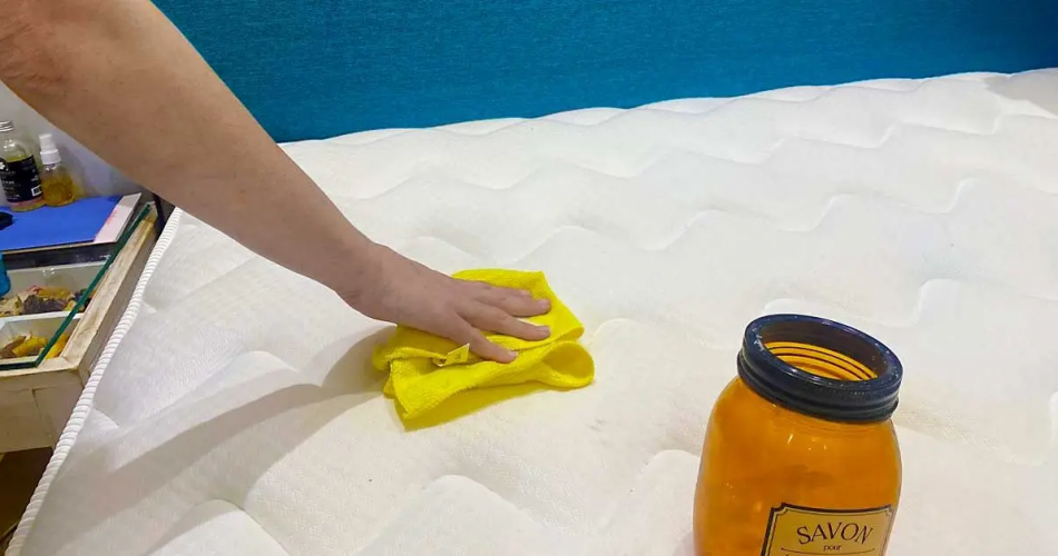 Nehmen Sie als nächstes ein Mikrofasertuch, befeuchten Sie es (nicht zu stark) mit der Lösung und reiben Sie es auf einer Seite der Matratze. Warten Sie, bis es getrocknet ist, und waschen Sie die andere Seite auf die gleiche Weise.