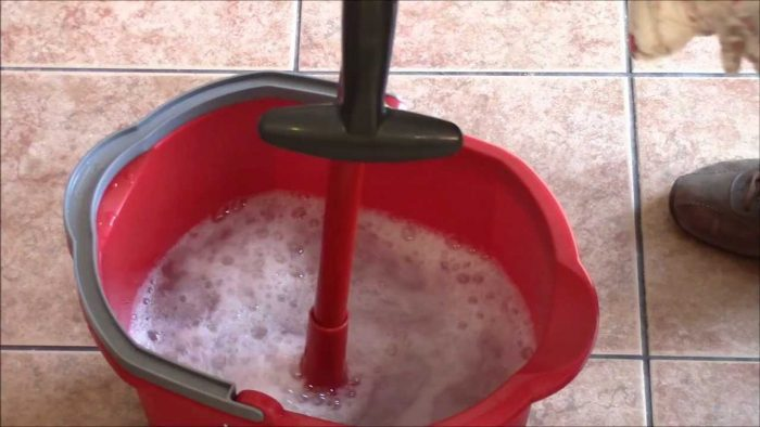 Lösen Sie einfach etwa 200 Gramm Natron in einem Eimer mit heißem Wasser auf und reinigen Sie die gesamte Bodenoberfläche mit einem Tuch.