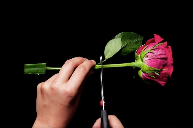 - Halbiere die Rose mit einer Gartenschere, vorzugsweise unter dem Blattteil des Stiels.