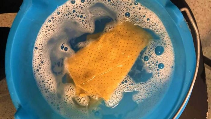 Nachdem Sie den Eimer mit Wasser gefüllt haben, lösen Sie die Löffel Bikarbonat auf, um später den Alkohol hinzuzufügen. Dann fügen Sie die Marseille-Seifenspäne hinzu (wenn Sie keine haben, können Sie einen Löffel Spülmittel oder hausgemachten Entfetter hinzufügen).