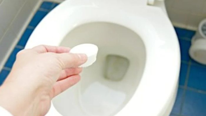 Nehmen Sie am nächsten Tag die erste Tablette und tauchen Sie sie in die Toilette. Warten Sie mit dem Spülen, es sollte sich vollständig auflösen und alle seine reinigenden und desodorierenden Eigenschaften freisetzen.