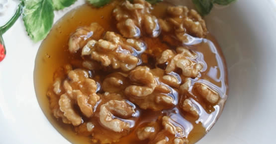 Wenn Sie unter Kopfschmerzen leiden, nehmen Sie 1-2 Esslöffel Walnüsse und Honig pro Tag zu sich, während Sie bei Schlaflosigkeit einfach 20 Gramm in einem halben Glas heißem Wasser verdünnen und eine halbe Stunde vor dem Schlafengehen trinken.