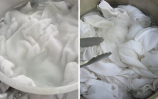 Zahnpasta hat aufhellende und antimikrobielle Eigenschaften und ist daher sehr wirksam bei hartnäckigen Flecken . Zum Waschen mit Zahnpasta nehmen Sie einfach diese und warmes Wasser. Geben Sie dann einfach etwa 2 Esslöffel Zahnpasta auf 1 L Wasser und vermischen Sie die beiden Produkte gut.