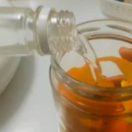 Die Rede ist von  Essig  . Tatsächlich können wir durch die Rückgewinnung eines Glases die Schalen der Orangen in Stücke brechen und Essig hineingießen, bis gerade so viel Essig hineingegossen wird, dass die Schalen vollständig mit der Flüssigkeit bedeckt sind.