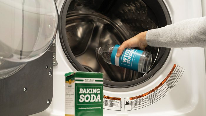 Bereiten Sie einfach eine dicke Paste aus Backpulver und Wasser zu, geben Sie diese auf einen Schwamm und reiben Sie sie sanft über die gesamte Füllung.